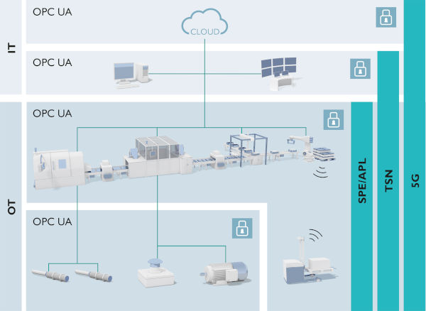 Además de la armonización común a todos los fabricantes de los perfiles de aplicación en campo, como E/S, seguridad o movimiento, Phoenix Contact observa en la unificación de los modelos de equipos una gran oportunidad. La configuración y el diagnóstico uniforme de los equipos en la red, así como las pruebas de conformidad normalizadas, garantizarán en el futuro una alta compatibilidad de los componentes de automatización, independientemente del fabricante. La integración de la tecnología Sensitive Networking (TSN) en el estándar OPC UA ofrece además nuevas posibilidades necesarias para la la comunicación en tiempo en real en la red. La sincronización temporal y la priorización de los datos garantizan que la comunicación IT y OT no se perturben entre sí ni influyan la una en la otra en la red. De esta forma, se logrará en el futuro una conexión generalizada de los equipos en campo en la nube y se podrá lograr una conexión continua de IT y OT.