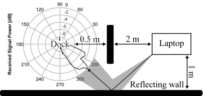 Imagen 2: Transmisión de datos a través de un canal de onda milimétrica exclusivamente a través de una trayectoria reflejada. Hay que tener en cuenta que el perfil angular de energía no incluye ningún lóbulo en la trayectoria de propagación con visión directa.