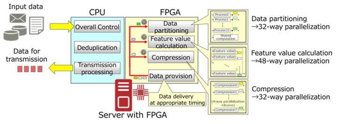 Fujitsu Laboratories ha desarrollado tecnología de paralelización FPGA que puede reducir significativamente el tiempo de procesamiento requerido para la deduplicación y compresión de datos implementando unidades de cálculo especializadas para partición de datos, cálculo de valores de características y procesamiento de compresión sin pérdidas en una FPGA en una configuración altamente paralela y habilitando un funcionamiento altamente paralelo de las unidades de cálculo, entregando datos en los momentos apropiados basados en predicciones de la finalización de cada cálculo.