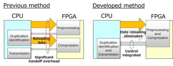 Anteriormente, al determinar si aplicar compresión sin pérdida a los datos basados en la identificación de la duplicación en esos datos, era necesario leer los datos dos veces, tanto antes como después de que se ejecutara la identificación de duplicación en la FPGA, aumentando la sobrecarga y evitando que el sistema ofreciera el suficiente rendimiento. Ahora, consolidando el traspaso de procesamiento en la FPGA, gestionando tanto el preprocesamiento para identificación de duplicación, como el procesamiento de compresión en la FPGA, y usando una secuencia de procesamiento que controla cómo se reflejan los resultados del procesamiento de compresión en la CPU en función de los resultados de la duplicación identificación, esta tecnología reduce la sobrecarga entre la CPU y la FPGA de volver a cargar los datos de entrada y de los intercambios de control. Esto reduce el tiempo de espera debido a la transferencia de datos y el control entre la CPU y FPGA, ofreciendo un funcionamiento coordinado eficiente de la CPU y el acelerador FPGA.