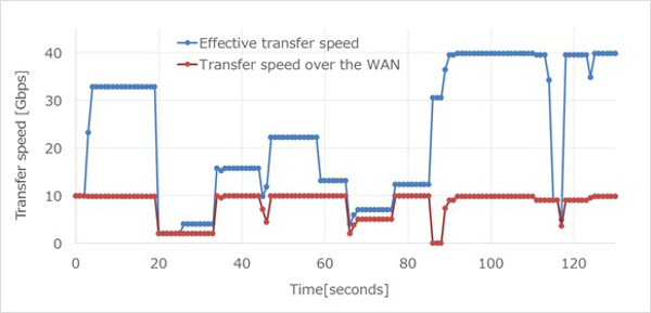 En un entorno de prueba donde esta tecnología se implementó en servidores que usan FPGAs y donde los servidores estaban conectados con líneas de 10 Gbps, Fujitsu Laboratories confirmó que esta tecnología logró tasas de transferencia efectivas de hasta 40 Gbps, el rendimiento más alto en la industria. Con esta tecnología, ha sido posible transferir datos a alta velocidad entre nubes, incluidos el intercambio de datos y copias de seguridad, lo que permite la creación de servicios en la nube de próxima generación que comparten y utilizan grandes volúmenes de datos en una variedad de empresas y ubicaciones.