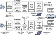 En la arquitectura VoIP, el Equipamiento en las Instalaciones del Usuario (Customer Premises Equipment, CPE) incluye servicios de voz como el DLC del PSTN. Pero entre los CPE de VoIP también se incluyen funciones de la CO de la PSTN, como generación de tono de llamada, detección de dígitos marcados, iniciación del establecimiento de llamada y funciones de soporte. La voz VoIP se suministra como paquetes a través de una red IP. La Figura 1 indica que hay varios parámetros que controlan la calidad de voz y cómo la red IP introduce algunos obstáculos, como la caída de paquetes, fluctuación (jitter), errores de paquete y fragmentación de éstos.