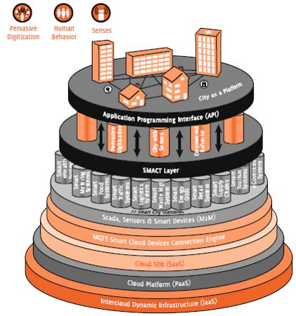 Por último, City as a Platform es el concepto donde confluyen el mundo digital y el físico. Los datos recogidos a través de sensores sobre el comportamiento humano se trasladan al mundo físico, a las infraestructuras para mejorar su funcionamiento. Por ejemplo, utilizando sensores y análisis de datos sobre el comportamiento, junto a la información sobre las infraestructuras, los coches pueden circular por la ciudad de forma autónoma, sin ningún problema. Los sensores, los análisis de gran cantidad de datos y las apps contribuirán a ajustar los elementos físicos de la ciudad a los flujos de movimiento.