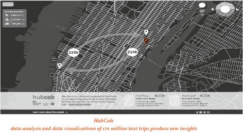 Por otro lado, en Nueva York existe un proyecto denominado HubCab que muestra el concepto de Sensible Cities. En este proyecto 13.500 taxis disponen de tecnología para recoger datos de los más de 170 millones de viajes realizados durante un año por los habitantes de la ciudad y convertir esta información en decisiones más inteligentes. El conjunto de datos contiene las coordenadas GPS y horarios de demanda de este servicio, así como recorridos, destinos y zonas más frecuentadas. Las cifras muestran que, sin reducir la comodidad del viajero, el 40% de los taxis se podrían compartir, lo que supondría una reducción de CO2 de 423 gramos por kilómetro de trayecto.