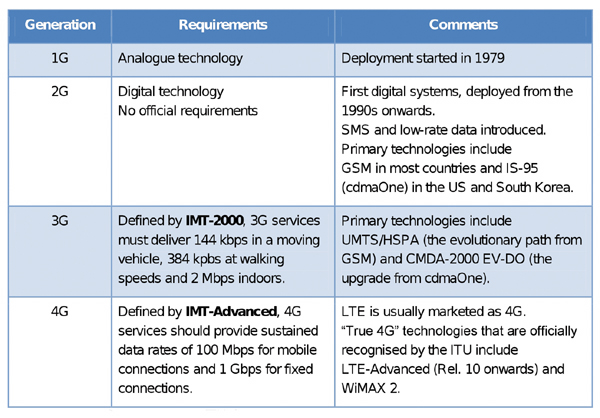 La tecnología utilizada en la interfaz de radio ha cambiado considerablemente a lo largo de los años. La primera generación (1G) de los sistemas móviles, basados ??en tecnología analógica, sólo se llevaba llamadas de voz.