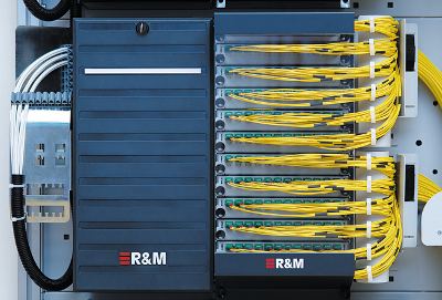 Der ODF kann mit Spleißmodulen, Patchmodulen und Kombinationsmodulen konfiguriert werden, die alle werkzeuglos und schnell montiert werden. Eine einzelne ODF-Einheit kann bis zu 2034 Fasern verwalten. Das System garantiert einen maximalen Biegeradius von 40 mm – ein entscheidender Faktor für ein zuverlässiges und spannungsfreies Fasermanagement und ein Qualitätsstandard für zukünftige Anwendungen mit hoher Kapazität und xWDM. Der aus Aluminiumprofilen gefertigte ODF (Open Distribution File) ist in den Grundabmessungen 300 x 300, 600 x 300 oder 900 x 300 mm erhältlich und 2,2 Meter hoch. R&M hat auf die vorderen Streben verzichtet, um Technikern und Wartungspersonal mehr Bewegungsfreiheit zu bieten.