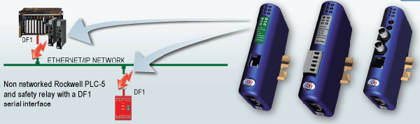 Example devices: all devices with DF1 interface, such as Rockwell/Allen Bradley PLC-5, SLC-500 and MicroLogix, can be connected to 13 different industrial networks such as DeviceNet, EtherNet/IP, ControlNet, Modbus/TCP, Profibus-DP, ProfiNet and CANopen.