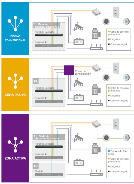 In a passive zone topology, all active equipment and power are also centralized in the telecommunications room. However, unlike the conventional design, a consolidation point is added, creating the flexibility that was lacking when all cabling originated from the telecommunications room. Instead, an intervention point is placed in the middle, allowing for modifications. This provides a significant advantage in environments like open-plan offices, where workspaces or cubicles change and are frequently relocated.