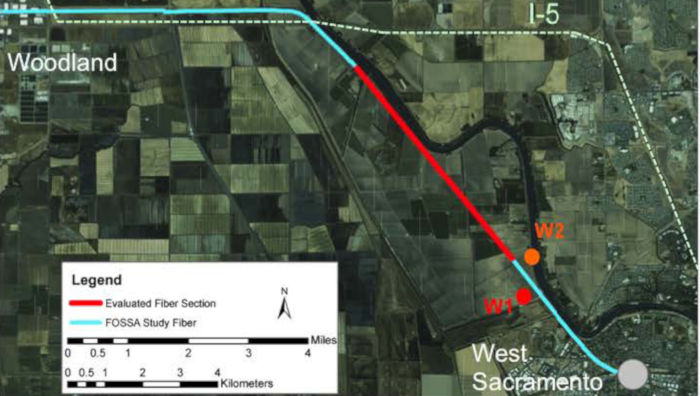 A research team led by Jonathan Ajo-Franklin of Berkeley Lab conducted its experiments on a 20-mile segment of the 13,000-mile-long ESnet Dark Fiber ESB that stretches from West Sacramento to Woodland, California. (Credit: Ajo-Franklin/Berkeley Lab)