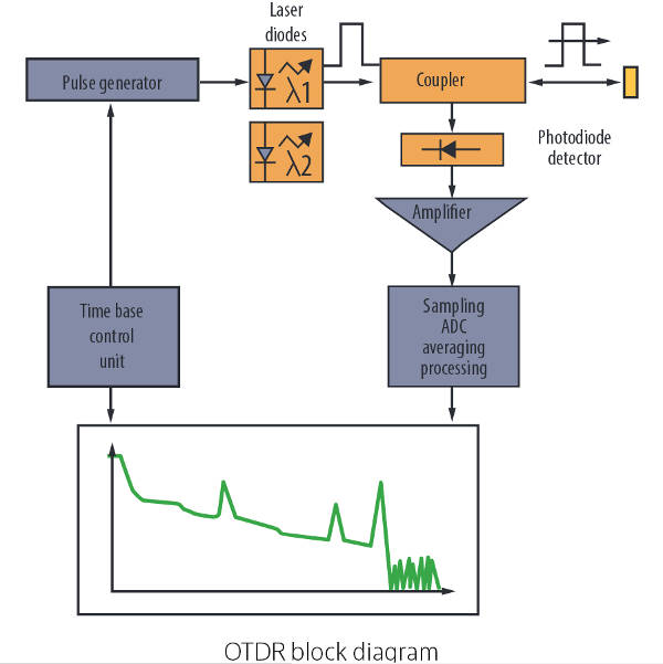 By "introducing" light pulses into one end of the fiber and analyzing the backscattered and reflected signals, an OTDR measures both optical distance (to elements such as splices, connectors, splitters, or multiplexers; to faults; or to the fiber end) and signal loss, optical return loss (ORL), and connector reflectance.