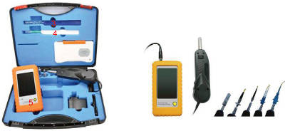 In addition to the 250x magnification microscope probe with adapters, the case includes a cleaning cassette and two cleaner pens (stick type): one for 1.25 mm and one for 2.5 mm.