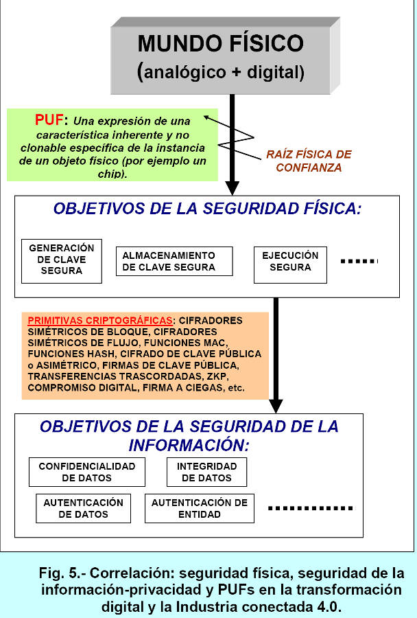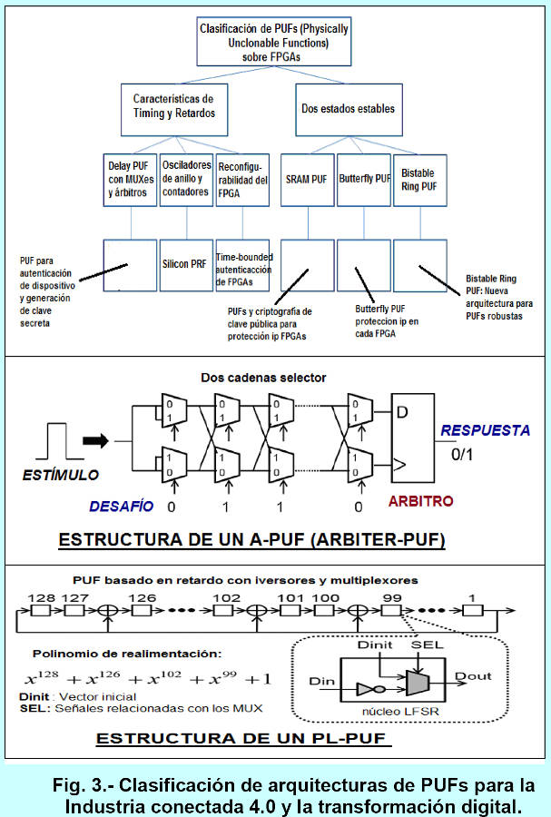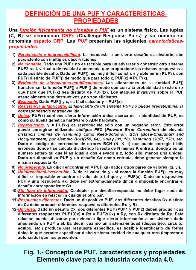 Cybersecurity and privacy (protection against all types of attacks) must be paramount in the four most relevant aspects of Industry 4.0: vertical integration (high flexibility, zero batch size), people as the main drivers of the value chain (systems follow people's needs, skills development by people, and mass customization), horizontal integration (value chains spanning the globe), and consistent engineering (systems engineering throughout the entire lifecycle with digital production). Industry 4.0, through the IIoT, has opened Pandora's box to all types of cyberattacks, from the most conventional to the most advanced, such as APT-based attacks. Addressing cybersecurity and privacy protection is a top priority, and one of the tools for this purpose is Physically Unclonable Functions (PUFs). Sandia National Laboratory markets technology that uses cryptographic cybersecurity techniques based on PUFs (the device is called SecuritySeal) to protect physical objects from potential fraud, such as counterfeiting radioactive materials, pharmaceuticals in containers, and so on. Cyber-Physical Systems (CPSs) are a computing paradigm increasingly used in various technologies and are the foundation of Industry 4.0. Achieving reliable CPSs requires mechanisms that ensure the integrity and authenticity of these systems. PUFs based on semiconductor technologies are presented as a highly suitable solution for building connections between the cyber (digital) and physical (analog) worlds and protecting CPSs in avionics, autonomous vehicles, factory machinery, production systems, industries, critical infrastructure with and without SCADA, financial engineering, and more. Some tasks performed by secure hardware components such as PUFs include: key storage, asymmetric cryptography (signature and encryption), for example, based on ECC/RSA-CRT, session key generation, random number generation, access rights verification, integrity verification, secure data storage, resistance against hardware attacks, certification/attestation, etc. We can identify various secure hardware components in mobile phones: SIM cards, eSIMs, security chips, secure SD cards, etc. In March 2007, the Idaho National Laboratory of the U.S. Department of Energy conducted an experiment or test called Aurora to demonstrate how a cyberattack could destroy physical components of an electrical grid. The experiment used software that rapidly opened and closed a circuit in a diesel generator, causing it to explode. This vulnerability was named the Aurora vulnerability and can therefore be exploited by a cybersecurity threat. The Department of Homeland Security (DHS) has since been working with the electrical industry to prevent future threats of this type. Currently, there are already robotic vacuum cleaners that move autonomously and allow remote video surveillance via smartphone, making them vulnerable to hacking by any attacker. Even more dangerous are the latest generation of toys and baby monitors, such as My Friend Cayla dolls, Hello Barbie, the Fisher-Price Smart Toy Bear, and the i-Que smart robot, which connect to the internet, record conversations with children, and allow some remote interaction via the internet (photos taken by the Bear, etc.).