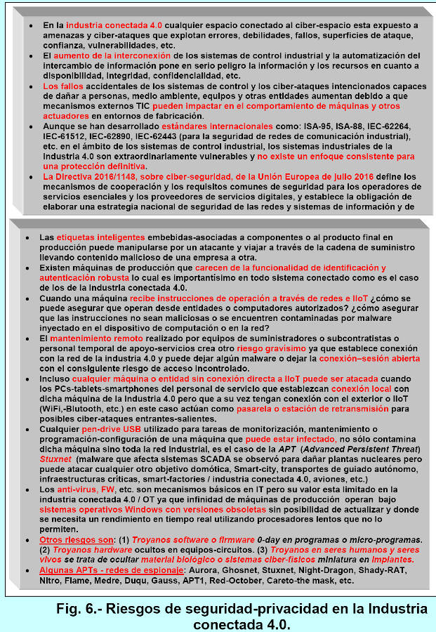 The concept of Industry 4.0 refers to cyber-physical production systems that integrate execution systems with analytical and planning capabilities. It represents a new way of organizing production resources based on the implementation of smart factories adapted to current production needs and processes, as well as the optimization of resources. Industry 4.0 offers numerous benefits, such as the interconnection and interoperability of elements through the IIoT (Industry Internet of Things), digital transformation, sensor monitoring and data aggregation, support for continuous improvement, decentralized decision-making, and increased productivity. However, this ideal scenario, coupled with the interconnectedness of Industry 4.0, also creates vulnerabilities that can lead to a wide range of cyberattacks. Preventing cyberattacks that compromise the security and privacy of production equipment and data is a top priority. It is clear that every Industry 4.0 ecosystem must be governed by cybersecurity and privacy, and within this ecosystem, several areas can be identified: (1) At the core are the factories of the future and factory clusters. At the most basic level are additive manufacturing with 3D printers (massive customization, rapid prototyping, etc.), advanced materials and nanotechnology (connectivity, added intelligent value to products, etc.), robotics (real-time autonomous productivity, total transparency), mechatronics (mechanics with cybernetics integration), and autonomous ground and air vehicles (lower costs, optimized workflow). At a higher level are sensors and actuators (traceability, predictive capabilities), and advanced manufacturing systems (cyber-physical systems, fully automated numerical control, M2M communication, and fully connected systems). At a higher level are cloud computing and Big Data/Analytics (enabling creativity, collaborative manufacturing, etc.). (2) Interacting with cloud computing would be the most external cybersecurity and privacy services (technological products with longer lifecycles, greater protection for IIoT-based manufacturing). (3) Interacting with the plants of the future would be supplier clusters, Logistics 4.0 (fully integrated supply chain, complete coordination, interconnected systems), customers with IIoT (real-time data capture, optimized stocks, object labeling, reduced waste, object-to-Internet communication using low-power radio-frequency RFID with and without chips, Bluetooth, ZigBee, UWB, etc.) and mass customization (flexibility, on-demand manufacturing, perfect alignment with customer needs, with efficient mass production, higher-level customer-marketing interaction, etc.). (4) Interacting with the plants of the future would reveal the resources of the future (wind turbines, solar panels, geothermal energy, tidal-wave energy, etc. are renewable and clean energies and are found everywhere.