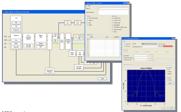 An advanced programming mode for creating radar models using a user-friendly, high-level graphical interface called the E-PRS Framework is available. With this tool, the user can generate a radar model according to their needs, simply by using the functional library included with the system.