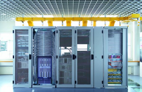 R&M ofrece el Raceway System para el enrutado protegido de cables, hasta los centros de distribución. La imagen muestra las canalizaciones instaladas sobre los armarios junto con la salida hacia un distribuidor FOM de R&M en una oficina central.