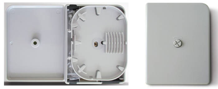 La caja tiene unas medidas de 103 x 133 x 30 mm con capacidad de empalme de 4 a 12 fibras.