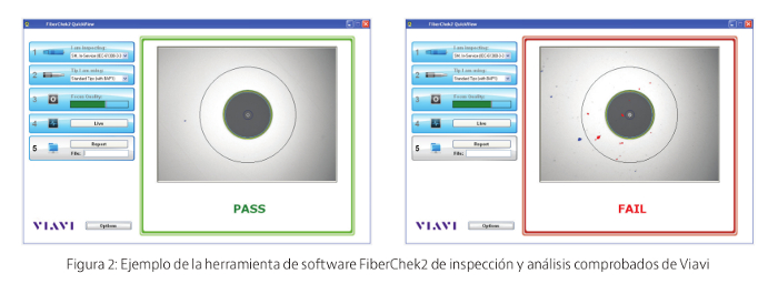 Los valores de calidad que se utilizan en la Norma IEC son el resultado de años de extensas pruebas sobre conectores rayados, dañados o sucios, llevadas a cabo por una coalición de expertos de la industria, incluidos proveedores de componentes, fabricantes contratados, proveedores de equipos de red, proveedores de equipos de pruebas y proveedores de servicios. Este trabajo ha sido publicado con anterioridad en varios documentos, tal como se menciona en la sección de Referencias del presente informe. Al comprender las variables y las limitaciones de la inspección visual y manual, Viavi Solutions, fabricante de soluciones de medición y pruebas para conexiones de fibra óptica, aportó su software automatizado para análisis e inspección objetiva, FiberChek2™, (tal como se muestra en la Figura 2), a la IEC para su utilización en el desarrollo de la norma de inspección visual. La automatización del proceso evaluativo por medio de parámetros derivados de la investigación extraídos de pruebas llevadas a cabo por la coalición de expertos de la industria mencionada anteriormente le proporcionó a la IEC un estándar de calidad repetible que garantizará un nivel común de rendimiento, lo cual dará lugar a un impacto positivo tanto sobre el producto como sobre el rendimiento de la red. Luego de más de 8 años de realizar pruebas sobre una base de datos en constante crecimiento sobre fibras y dispositivos ópticos (por ejemplo, SM, MM; Ribbon, E2000, SFP/XFP, fibras optimizadas para curvaturas, lentes, y otras interfaces), que combinado con el uso generalizado en la industria por parte de los fabricantes de componentes, entes integradores/CM, fabricantes de de equipos originales, instaladores de terceros y proveedores de servicios, hacen del software de Viavi la única herramienta de software para una inspección objetiva automática comprobada que asegure el cumplimiento de la Norma IEC en cada paso del ciclo de vida de la fibra