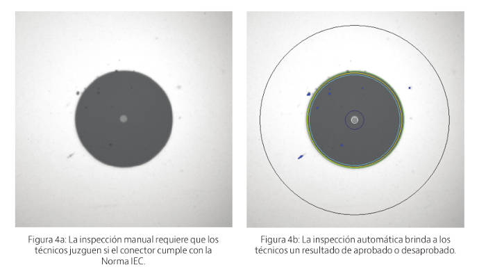 terminaciones de los conectores, no es confiable ni práctico certificar el cumplimiento en este punto de la instalación a través de imágenes o informes, tal como lo muestra la Figura 4a. Para asegurar que se cumpla con las normas de la IEC, el método disponible más efectivo es la inspección automatizada de terminaciones de conectores de fibra óptica mediante el software de inspección y análisis diseñado según los criterios evaluativos de la Norma IEC. Gracias a este software, los técnicos de todos los niveles de conocimiento pueden lograr tanto el cumplimiento de la norma como la certificación a través de imágenes e informes, tal como se muestra en la figura 4.