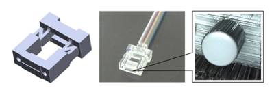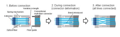 • Un mecanismo de resorte para conectores ópticos que se deforma ligeramente al conectar fibras ópticas (Figuras 1 , 2). Esto permite la deformación en el propio conector óptico para introducir pequeñas curvas en las fibras ópticas como una forma para adaptarse a las diferencias en sus longitudes, de manera que sus puntas se alinean.• El procesado láser de las puntas de las fibras ópticas resulta en superficies equivalentes a las logradas a través del pulido (Figura 1), de modo que las fibras ópticas pueden alinearse sin huecos.