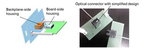 Fujitsu Laboratories y Furukawa Electric han desarrollado conjuntamente este conector óptico para uso en placas, y con un envolvente de conector óptico que tiene capacidad para cuatro conectores ópticos en un espacio compacto (2), este diseño permite un máximo de 96 fibras ópticas para conectar (Figura 3).
