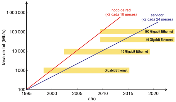 El espectacular aumento en los requisitos de ancho de banda de las redes, motivado en gran medida por Internet (Web 2.0) y las aplicaciones de vídeo bajo demanda (IPTV), está provocando la continua actualización de los routers de los proveedores de servicio con nuevos interfaces 10G. De hecho, se están ya desplegando interfaces a 40 Gb/s y algunos routers DWDM de larga distancia ya transportan canales 40G. Sin embargo, la necesidad de 100 Gigabit Ethernet (100GbE) es cada vez más evidente (figura 1). La tasa de 100 Gb/s supone la extensión natural de la jerarquía Ethernet (10M/100M/1G/