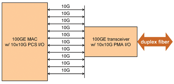 En la figura 2 se muestra esquemáticamente un modelo de arquitectura 100GbE MAC, denominada 100GE, con 10 subcapas I/O de codificación física 10G para 10 km de fibra óptica monomodo (SMF). El reto a la hora de estandarizar este tipo de aplicaciones es conseguir desarrollar transceptores de primera generación utilizando la tecnología actual, y posteriormente ir mejorando en coste, potencia y tamaño conforme aparezcan nuevas posibilidades tecnológicas. En cualquier caso, la elección de las longitudes de onda de funcionamiento debe ser acorde con las tecnologías tanto actuales como futuras.
