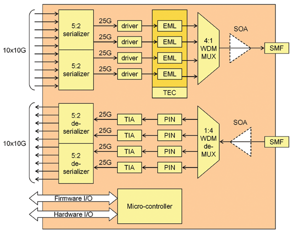 Las conversiones de 10 Gb/s a 25 Gb/s y viceversa se consiguen mediante el empleo de circuitos serializadores 10:4. En transmisión, las señales se modulan empleando 4 láseres con moduladores de electroabsorción (EML), los cuales generan 4 longitudes de onda diferentes que se multiplexan sobre la misma fibra. Para alcances inferiores a 4 km, puede emplearse tanto segunda como tercera ventana. Existe también la posibilidad de utilizar 4 láseres con modulación directa, pero en este caso a 1550 nm se requieren técnicas de compensación de dispersión. En recepción se realiza el proceso inverso, los 4 canales ópticos WDM se demultiplexan y se fotodetectan con sendos receptores compuestos de un fotodiodo PIN y un amplificador de transimpedancia (TIA). Los espaciados de los canales WDM admiten distintas posibilidades que se enumeran a continuación: rejilla IEEE LX-4 de 25 nm, rejilla CWDM ITU G.694.2 de 20 nm, o rejillas DWDM ITU G.694.1 de 400 a 800 GHz (2 a 4 nm). Las dos primeras permiten la utilización de láseres sin control de temperatura.