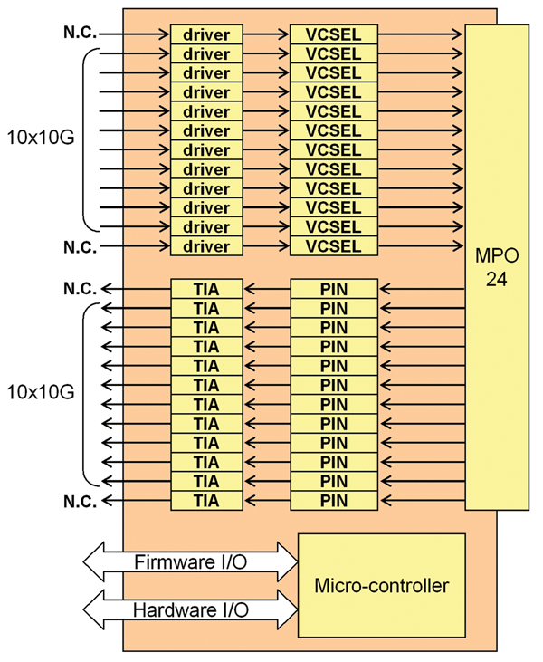 figura 4 muestra la arquitectura de un transceptor 10x10G MMF. El interfaz eléctrico de entrada/salida maneja señales de 10 Gb/s, al igual que en el caso de los transceptores SMF, por lo que pueden intercambiarse fácilmente. En realidad, la arquitectura incluye 12 canales, de tal modo que puedan soportarse otras aplicaciones además de 100GbE, como por ejemplo InfiniBand. Para el interfaz óptico se emplea un conector MPO de 24 fibras (12 en transmisión y 12 en recepción), que puede sustituirse también por sendos conectores MPO de 12 fibras cada uno. La conexión de las 24 fibras debe alinearse cuidadosamente con los transmisores VCSEL y con los fotodiodos PIN, de forma similar a como ocurre con los transceptores POP4 y QSFP. Esto suele ser más complicado y costoso que en el caso del alineamiento de 12 fibras por separado (similar a los módulos SNAP12), si bien se consigue una mayor densidad y un manejo más simple del cable. En la figura 5 se muestran fotografías de los dos tipos de conectores MPO.