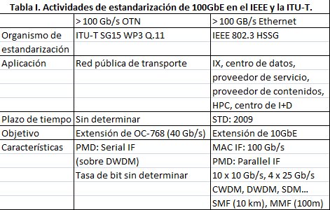 /10G) que ha tenido gran éxito durante las últimas décadas. Si bien hay quienes opinan que 100GbE llega tarde. Se trata de aquellos que han estado trabajando con vendedores que poseen soluciones propietarias a 100 Gb/s y consideran que los estándares 100GbE debieron finalizar mucho antes. Los dos principales organismos de estandarización que han participado en estas tareas son el IEEE (802.3 Higher Speed Study Group, HSSG) y la Unión Internacional de Telecomunicaciones (ITU-T). Sin embargo, existen también una serie de alianzas y asociaciones que han estado involucradas en el proceso de especificación del estándar 100GbE, como son: Alliance for Telecommunication Industry Solutions (ATIS), Optical Internetworking Forum (OIF), Ethernet Alliance, Road to 100G Alliance, Optoelectronics Industry Development Association (OIDA). Uno de los puntos más delicados del proceso de estandarización es el relativo a la definición de la especificación 40GbE, pues como es sabido, hoy en día los routers de mayor capacidad se desarrollan con puertos a 40 Gb/s y se necesita compatibilidad entre Gigabit Ethernet y la jerarquía SONET/SDH cuyas tasas de bit normalizadas se definen utilizando múltiplos de cuatro. Este es posiblemente uno de los mayores puntos de discusión en la actualidad, a lo que se une el hecho de que Gigabit Ethernet sí que está preparado para manejar tráfico asíncrono, pero SONET/SDH no resulta el medio más eficiente para manejar el actual volumen de tráfico IP. En este artículo comentaremos las iniciativas de estandarización que están llevándose a cabo hoy en día en relación con 100GbE, al tiempo que presentaremos algunas de las tecnologías que se van a utilizar en la implementación de los primeros dispositivos comerciales.