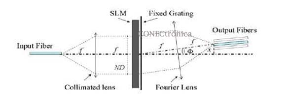 La luz proveniente de la fibra óptica de entrada se colima, es decir, se paraleliza a través de una lente e ilumina el SLM y una red de difracción fija. Una segunda lente, a la salida, acopla el primer orden de difracción de la luz en la fibra o fibras ópticas de salida que se coloca en el plano focal de la lente. Aquí se localiza la transformada de Fourier del holograma, que para el caso de un holograma de barras, es un conjunto de puntos equidistantes de intensidad luminosa variable.