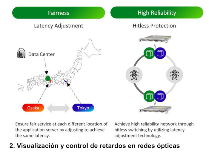 Para resolver estos problemas, Fujitsu ha desarrollado 1FINITY T250, una solución de transmisión óptica equipada con la tecnología de ajuste de latencia propia de Fujitsu que visualiza y controla los retrasos y fluctuaciones de la red y permite la conmutación sin golpes de las rutas entre los nodos de los equipos de transmisión óptica.