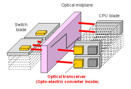 Nuevo transceptor desarrolladoPara tener éxito en la producción de un transceptor óptico compacto con la óptica de interconexión necesaria para la alta velocidad y transmisión de datos de gran ancho de banda, Fujitsu Laboratories ha desarrollado un convertidor opto-eléctrico para pasar las señales electricas (opticas) a señales ópticas (eléctricas) a través de un dispositivo óptico.