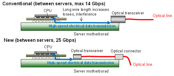 Los avances en la potencia de proceso de CPU han aumentado considerablemente las capacidades de proceso de datos de los servidores. Ahora, con la tecnología de virtualización mejorada que permite que una sola CPU pueda ejecutar múltiples procesos, el volumen de datos que pasan entre CPUs y entre las CPUs y los periféricos se incrementa enormemente. Si bien los servidores de hoy en día utilizan interconexiones ópticas capaces de alcanzar velocidades de datos de 10 Gbps por canal, las expectativas para el futuro son servidores que van a ser capaces de alcanzar 25 Gbps. Además, como indica la Figura 1, también se espera que interconexiones ópticas se pueden utilizar no sólo para las comunicaciones de datos entre servidores, sino también entre las placas dentro de un servidor, ya que las tasas de datos mayores son difíciles de alcanzar con las comunicaciones eléctricas.