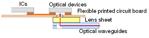 Convencionalmente, de manera eficiente la transmisión de señales ópticas entre convertidores opto-eléctricos y fibra óptica (acoplamiento óptico) necesitaba una unidad de acoplamiento óptico que consistía en un componente de lente y un conector óptico (Figura 3). Sin embargo, el tamaño del componente de lente era grande y el coste fue alto. Esta nueva construcción consta de un convertidor ópto-eléctrico con una placa de circuito impreso flexible que ha sido equipada con dispositivos ópticos y circuitos integrados, permitiendo un transceptor óptico compacto. Además, Fujitsu Laboratories ha desarrollado también una rentable lente hoja tipo película que se apila en la parte inferior de la placa de circuito impreso flexible, solucionando los problemas mencionados anteriormente.