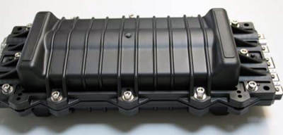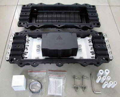 Boîtier étanche mural pour la réalisation de 144 épissures de continuité et de connexions de dérivation, avec accès pour les câbles non coupés.