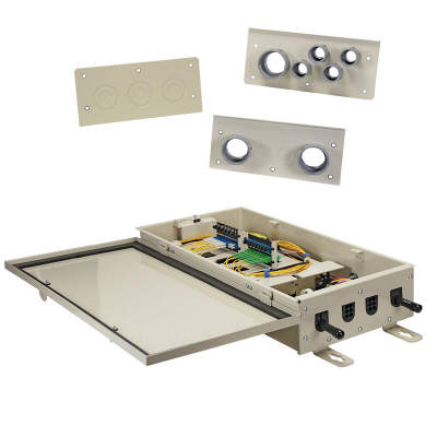 Le panneau de jonction est équipé de connecteurs LGX® 118, permettant l'installation de différents types de connecteurs selon diverses configurations. Le boîtier est doté d'une base résistante aux rayures et à la poussière et d'un couvercle à charnière entièrement étanche. Ce couvercle peut être installé de chaque côté du boîtier lorsque l'espace est limité. Le châssis interne et la plaque arrière sont amovibles et peuvent être utilisés sur une table de jonction pour l'épissure, le routage et la gestion des fibres. La base d'entrée de câble offre quatre configurations interchangeables permettant l'installation des câbles via un système de jonction ou par des raccords de conduit préinstallés.
