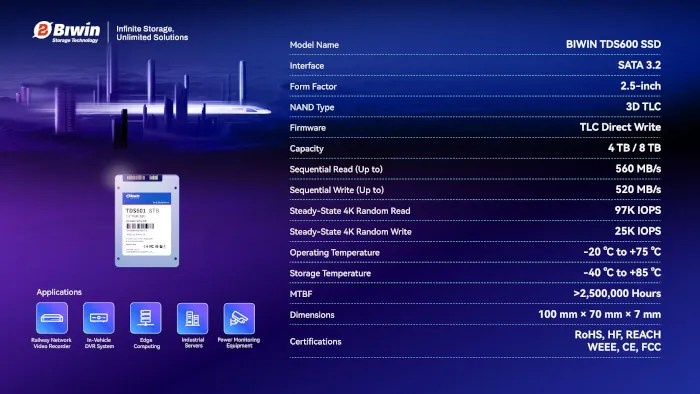Son architecture logicielle est optimisée pour les écritures continues et les charges de travail intensives, garantissant une stabilité même en conditions de fonctionnement constantes. Il constitue ainsi une solution idéale pour les systèmes DVR/NVR avancés, l’informatique de périphérie et les environnements industriels exigeants en matière de stockage.