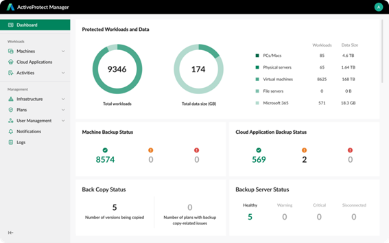 • Visibilité des données : Vous pouvez consolider et valider jusqu’à 150 000 charges de travail et surveiller 2 500 sites via un tableau de bord unique, y compris toutes les sauvegardes et les données archivées sur votre infrastructure de sauvegarde.