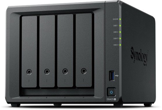 Le DS425+ à 4 baies offre une capacité de stockage fixe allant jusqu'à 80 To de données brutes, idéale pour les déploiements à petite échelle avec des besoins de stockage constants. Pour la connectivité réseau, le DS425+ est équipé d'un port 2,5 GbE et d'un port RJ-45 1 GbE. Il prend également en charge les SSD M.2 NVMe pour la mise en cache SSD ou le stockage flash haute performance.