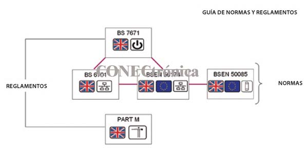 Por último, cabe considerar dos elementos; son la Parte M del BS7671 y BS/EN 50085 y las normas europeas de entronque; en la BS/EN 50174-2 se hace referencia a las últimas de la siguiente manera: