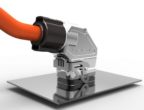 El innovador sellado del revestimiento del cable (que ofrece protección de nivel IP 69K) genera dos líneas de compresión con forma de anillo alrededor del revestimiento del cable híbrido. Se pueden montar cables de 13 a 17 milímetros de diámetro con un tamaño de sellado y sin herramienta controlada por par. Una abrazadera metálica actúa como protección contra tirones, asegurando de este modo una fuerza de tensión entre cable y conector superior a 150 N. Al mismo tiempo la banda de la abrazadera ofrece prácticamente un contacto de apantallamiento del cable que cubre 360°.