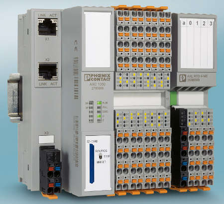 Para crear estaciones locales, los módulos de E/S del sistema de E/S Axioline se pueden conectar en serie a través del bus integrado Axiobus. Las interfaces Ethernet del controlador permiten integrarlo en redes ya existentes y conectar otros módulos de E/S descentralizados. Para ello, el usuario puede elegir entre los protocolos de comunicación TCP/IP, UDP, Modbus/TCP o Profinet.