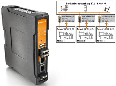 Las direcciones IP se implementan virtualmente con NAT 1:1. Las máquinas en serie con idéntica configuración IP pueden operar ahora en paralelo e integradas en redes de nivel superior sin necesidad de asignar rangos de direcciones IP individuales a cada una de ellas.