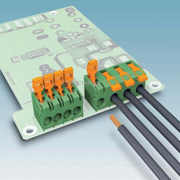 Las conexiones por resorte también se están instaurando en el cableado de equipos. En el área de potencia, como resultado de las grandes secciones de cable involucradas, los sistemas más utilizados hasta el momento son la clásica conexión por tornillo y la conexión por perno. Las nuevas bornas para placa de circuito impreso PLH 16 de Phoenix Contact demuestran que la electrónica de potencia también puede ser cableada de manera rápida y elegante (Figura 1). Conductores con una sección de hasta 16 mm2 pueden ser rápidamente conectados usando esta borna para placa de circuito impreso, accionada mediante una palanca. Esta innovadora tecnología es sencilla e intuitiva: el cable se introduce en el receptáculo habilitado para ello, con el resorte abierto, y a continuación únicamente se ha de presionar levemente la palanca hacia abajo, para cerrar el resorte y establecer el contacto.