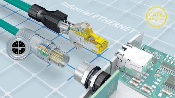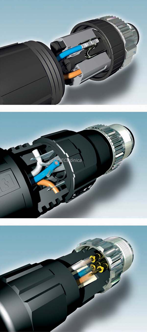 En el entorno industrial los conectores están sujetos a altas demandas nada comparables con las de un entorno de oficina. Sin embargo, en ambas áreas, la tasa de transferencia de datos y cantidad de datos están continuamente en aumento. Como consecuencia, Phoenix Contact ofrece componentes con tecnología de conexión rápida de alta calidad para los interfaces de comunicación clásicos. Gracias a su nuevo concepto de apantallado, el nuevo conector RJ45 para Cat6A puede manejar velocidades de transmisión de 10 Gbits/s (Figura 2). En este caso el ensamblado también es sencillo y rápido: los conductores se introducen en la carcasa y son cortados a ras. A continuación, las tapas de conexión se presionan hacia abajo, y se encaja la carcasa con el resto del conector. Durante el ensamblado, el aislante de los conductores es automáticamente traspasado por los ocho elementos de corte del interior del conector, lo que establece un contacto muy fiable, que puede ser reutilizado hasta en 10 ocasiones.