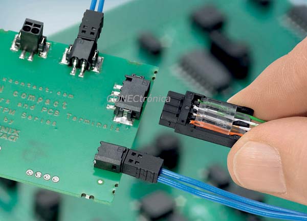 El sistema de conexión Piercing, muy similar al anterior en su concepto, se emplea para aplicaciones en placas de circuito impreso, donde el espacio cobra vital importancia. Cada milímetro que se ahorre en la tarjeta puede ofrecer enormes beneficios. En línea con ello nacen los nuevos conectores mini PTSM y PTPM, ambos con un diseño plano y compacto. Su tecnología de conexión Piercing permite conectar los conductores, sin desaislar, de forma inmediata y sin necesidad de herramientas (Figura 4). La carcasa de base correspondiente está disponible en versiones horizontal y vertical, y tanto para soldadura por reflujo THR, como SMD, pudiendo realizarse su montaje de forma automática con las máquinas “pick & place”.