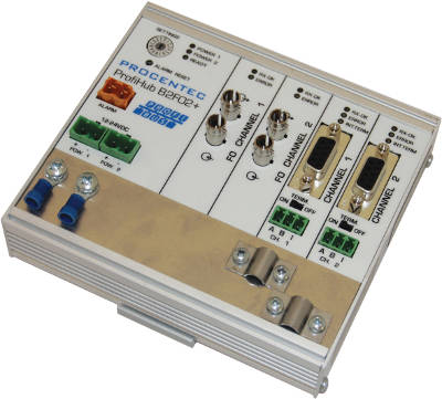 ProfiHub B4FO2+ ofrece en un único dispositivo cuatro repetidores transparentes y galvánicamente aislados, además de un módulo de enlace óptico, y es capaz de actuar como conversor de fibra óptica a puerto de serie RS-485. Su diseño permite la conexión de 4 segmentos DP/RS485 que individualmente pueden gestionar hasta 31 dispositivos con una longitud estándar. ProfiHub B2FO2+ ofrece similares funcionalidades con dos repetidores transparentes y galvánicamente aislados y un módulo de enlace óptico.