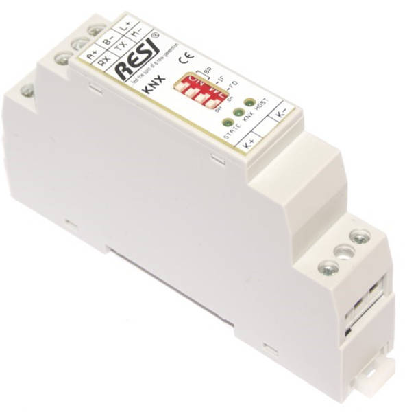 Comunicación del servidor vía RS232 or RS485 con Modbus/RTU o ASCII. Velocidades de comunicación: 9600, 19200, 38400 o 57600 bps, con o sin paridad, 8 data bits, 1 stop bit, todos los 32768 grupos EIB/KNX están soportados. Aislamiento galvánico entre EIB/KNX y parte serie. Posibilidad de configuración de hasta 300 entradas, configuración de grupos EIB/KNX, registros internos con el software específico del fabricante.