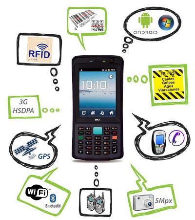 Dispone de entrada de datos mediante pantalla táctil y gran conectividad mediante 3G, RFID, lector de códigos de barras/2D, teléfono móvil, Wi-fi, bluetooth…