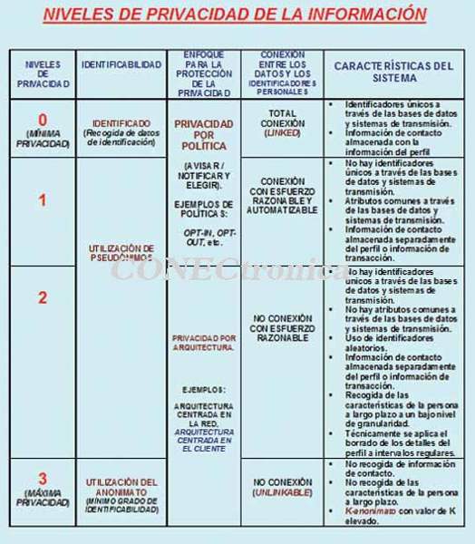 La privacidad de la información es la capacidad de los individuos e instituciones para ejecutar un grado sustancial de control sobre la recogida-captura, uso y revelación de su información personal. Es decir, es la capacidad de individuos e instituciones para controlar los términos bajo los que su información personal es adquirida y utilizada. Controlar por ejemplo el grado de reputación de una empresa en motores de búsqueda de alto rendimiento como Google, Yahoo, etc. Existen políticas de cumplimiento como LOPS/RMS, etc. Por su parte la seguridad de la información es el proceso continuo y reiterativo de proteger los datos y recursos de accesos, utilización, revelación, destrucción, modificación o trastornos no autorizados. La privacidad posibilita el control del individuo/institución de su información personal/institucional, en cambio la seguridad permite el proceso de proteger cualquier información o recurso. La seguridad por tanto puede ayudar a establecer privacidad (pero no es privacidad) y viceversa. Algunas herramientas de privacidad utilizadas comúnmente son los gestores de cookies, anonimizadores (Tor es un sistema de anonimato para Internet, permite a los usuarios enviar mensajes que no pueden ser seguidos, por ejemplo en navegación Web, chat, P2P, etc. Actualmente posibilita utilizar GUI además del antiguo CLI), herramientas de cifrado y esteganografía, utilities de disk wiping, agentes de usuario P3P, tecnologías ZKIP/CS, remailers para el anonimato del correo electrónico, los túneles seguros, la banca anónima, los antivirus con funcionalidades de eliminación de cookies de seguimiento, troyanos y spyware, etc. La exoinformación privada es la que se deduce de los datos que despedimos durante nuestras actividades de búsqueda de información. La información personal es, bien la que liberamos de forma inconsciente, aquella cuya liberación no podemos controlar, es el caso por ejemplo del espionaje con cookies de seguimiento en la navegación Web, las Webcams, el GPS de los móviles, etc., o bien la que nos coaccionan para que la liberemos sería el caso de las aceptaciones que nos imponen para poder disponer de un servicio Web, Red Social, un sistema operativo o un recurso en general. Otros ejemplos de exoinformación privada son los tonos que se generan al pulsar las teclas en un teléfono o un teclado de acceso para abrir una puerta, su sonido revela el número al que se llama o la contraseña de apertura, el número de la seguridad social de algunas licencias de conducir cuando se presentan como una forma de identificador, tarjetas de crédito no trituradas encontradas en algunas papeleras ofrecen la conexión entre el nombre de un individuo y su dirección.